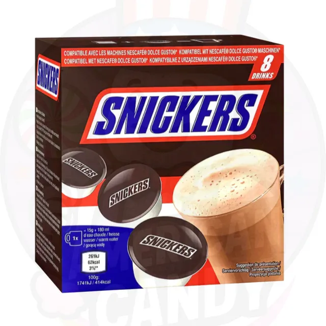 Los Nescafé Dolce Gusto Snickers son cápsulas de café con el auténtico sabor de Snickers, una combinación irresistible de chocolate con leche, caramelo y cacahuetes tostados que se funden en una bebida dulce, suave y deliciosa. ????????